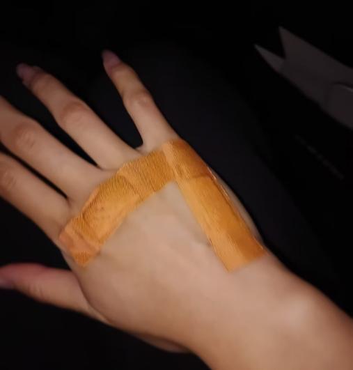 △在事故中手部受了伤。受访者供图。