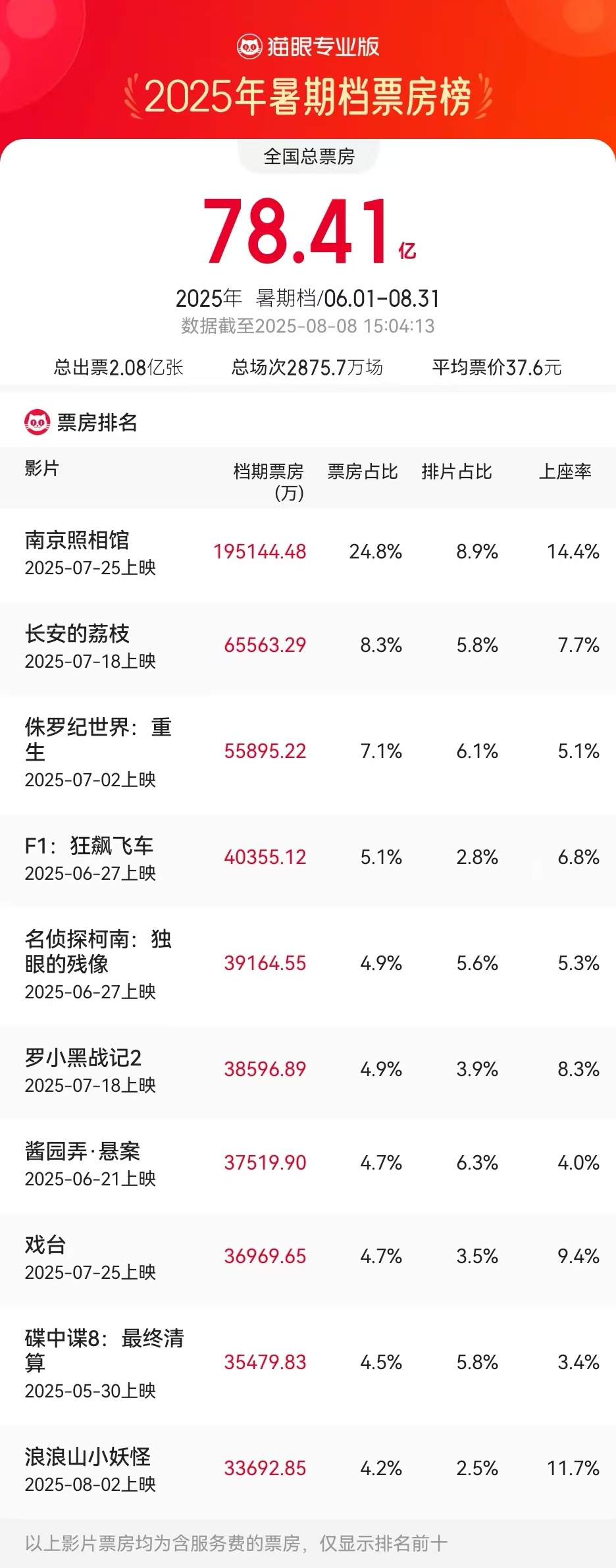 2025年暑期档已过去三分之二,伴随着《东极岛》的上映,暑期档愈发“火热”。猫眼专业版数据显示(截至8月8日15时),暑期档总票房超78亿元。其中,排名前10的影片票房均超3亿元。具体来看,《南京照相馆》稳居榜首,累计票房19.5亿元;《长安的荔枝》排名第二,累计票房6.5亿元;《侏罗纪世界:重生》排名第三,累计票房5.5亿元。