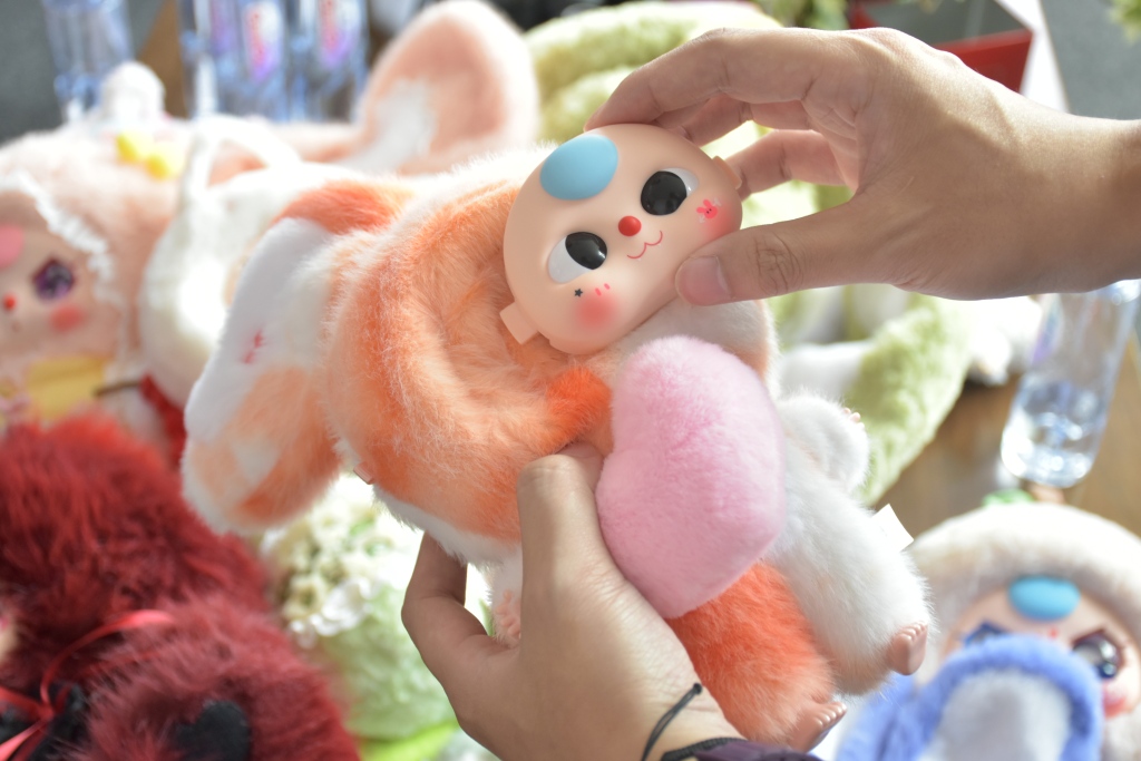 大漂亮公司凭借“萌粒”起家,但真正打开主流市场的,是毛绒与搪胶工艺的结合。其首创百元级毛绒玩偶脸部玩法,脸片可拆卸、瞳孔可更换、眼珠可转动,刘海与面部涂鸦还可随心情DIY。