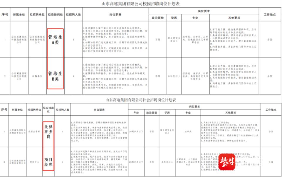 网传“山东高速录用清北牛津生”,官方公告:招聘岗位为管培生、法务