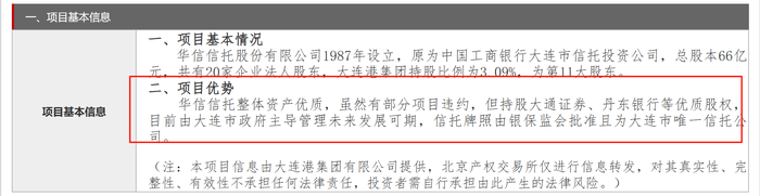 但相比于2023年7月首次挂牌中提到“虽有部分经营项目的风险暴露”,最新挂牌介绍中已无“风险”二字。大连港集团表示,华信信托整体资产优质,虽然有部分项目违约,但持股大通证券、丹东银行等优质股权,目前由大连市政府主导管理未来发展可期。