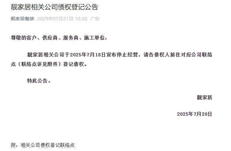 7 月 21 日,风波中的靓家居通过官方微信公众号发布公告称,其相关公司已于 2025 年 7 月 18 日宣布停止经营,要求各债权人前往对应公司联络点登记债权,公告落款日期为 7 月 20 日。