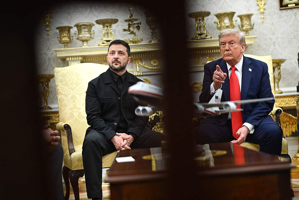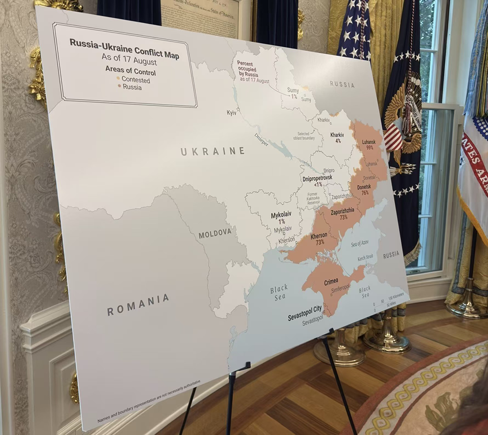 美国总统特朗普和乌克兰总统泽连斯基在白宫讨论可能的领土交换时,看了一份由美方准备的乌克兰东部地图,标注了俄罗斯所控制的乌方领土占比。