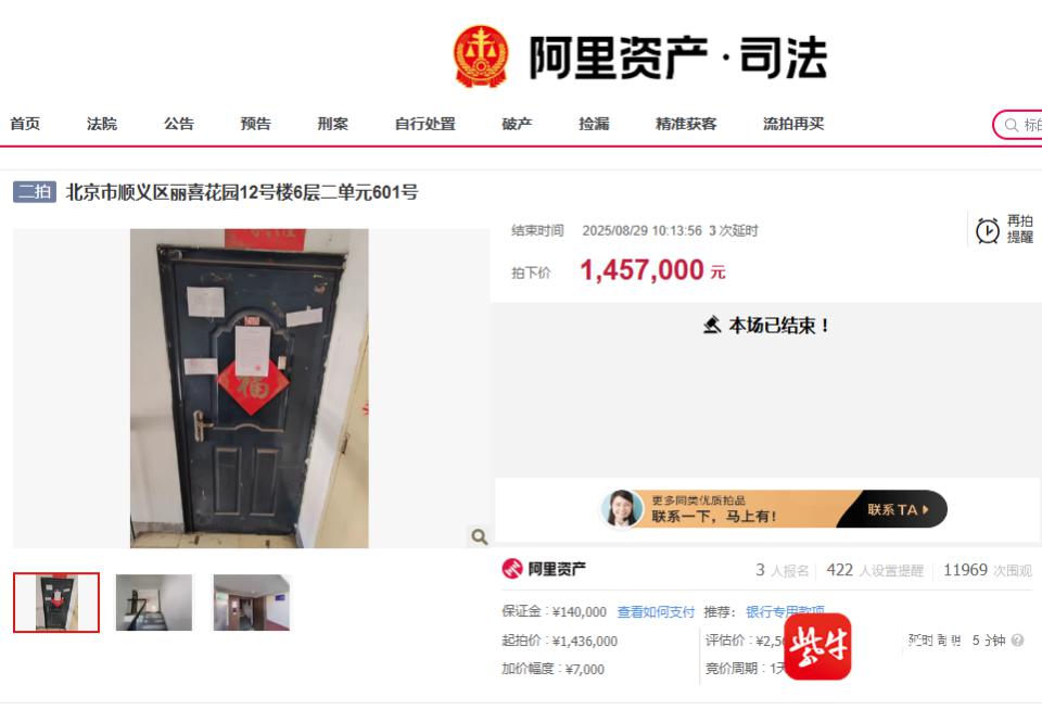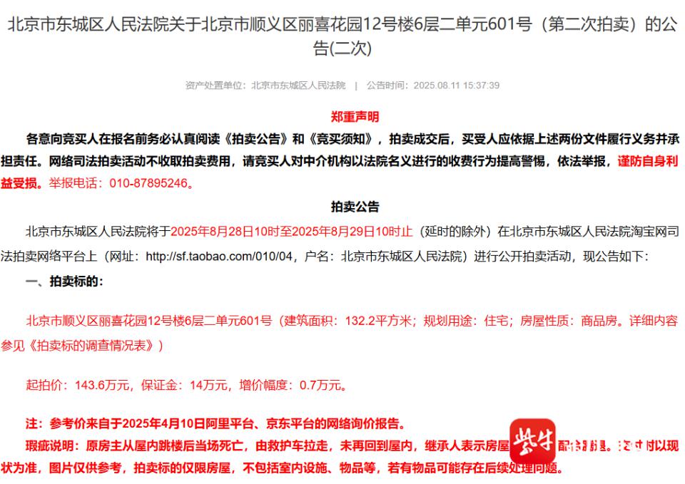 近日,阿里资产司法拍卖平台显示位于北京市顺义区丽喜花园的一套商品房,公告披露其主人跳楼身亡。该房产被法拍时因标注这一情况被称为 " 死亡备注 ",被广受关注。通过该平台,北京市东城区人民法院于 2025 年 8 月 28 日 10 时至 8 月 29 日 10 时止(延时的除外)对该套房产进行司法拍卖。扬子晚报 / 紫牛新闻记者看到,截至 8 月 29 日拍卖时间结束,包括 3 次延时共计 15 分钟,该套房产以 145.7 万元成交。