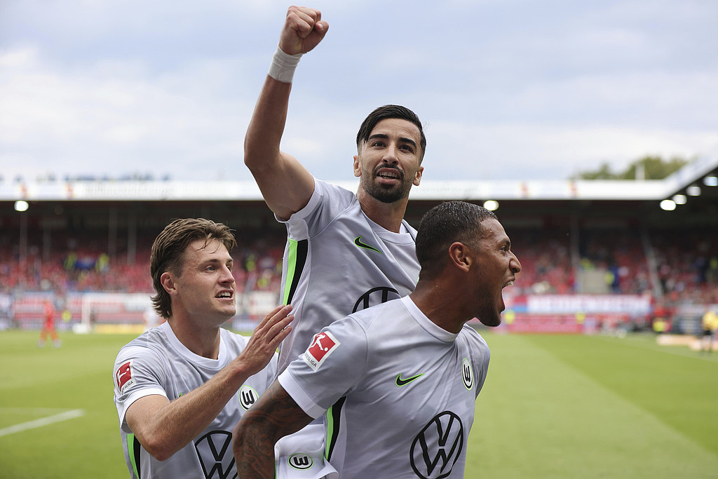沃尔夫斯堡球员庆祝进球。