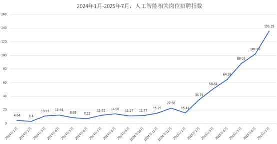 人才需求的激增直接体现在岗位数量上。脉脉数据显示,2025 年 2 月,人工智能相关岗位数量同比增长 10 倍,成为关键转折点。2025 年 7 月,人工智能相关岗位数量较 2024 年 1 月飙升 29 倍。
