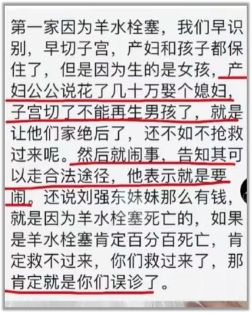 最离谱的一个,医生救回了羊水栓塞的产妇,结果被指责 " 误诊 ",还说现在产妇只生了个女儿,又没了子宫,让他们老 X 家绝后了。