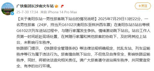 湖南衡阳东站一24岁男子跳下站台,铁路部门通报学习