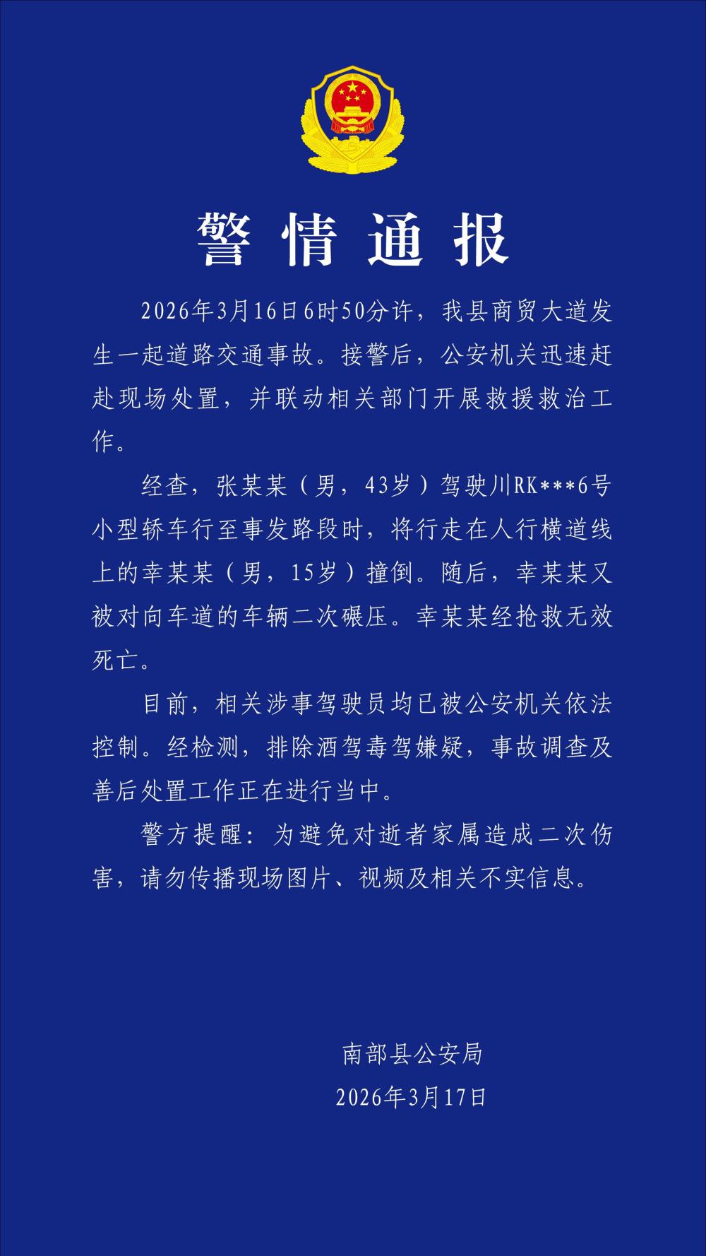 四川南部县公安局3月17日通报:3月16日6时50分许,我县商贸大道发生一起道路交通事故。接警后,公...