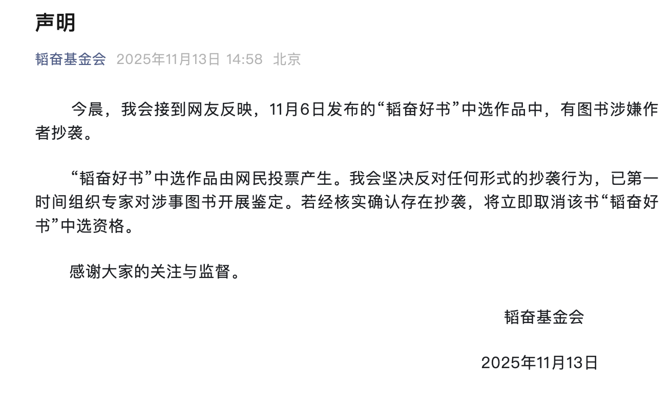 韬奋基金会回应“韬奋好书”中选作品涉嫌抄袭:已开展鉴定学习