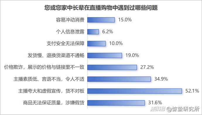 无锡市消费者权益保护委员会近日发布的一份《无锡市中老年网络直播消费情况调查报告》显示,近八成老人每3个月至少消费一次,单次最高消费集中在1000元3000元。但其中有52.1%的受访者遭遇过货不对板、虚假宣传的问题。