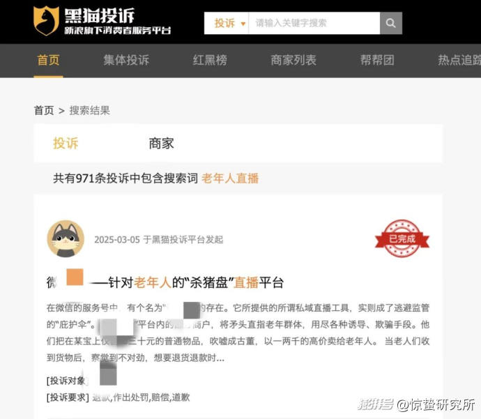 在黑猫投诉平台上看到,与老年人直播相关的投诉已达近千条。而在众多投诉内容中,私域直播间因为更具隐蔽性,引起了惊蛰研究所的注意。