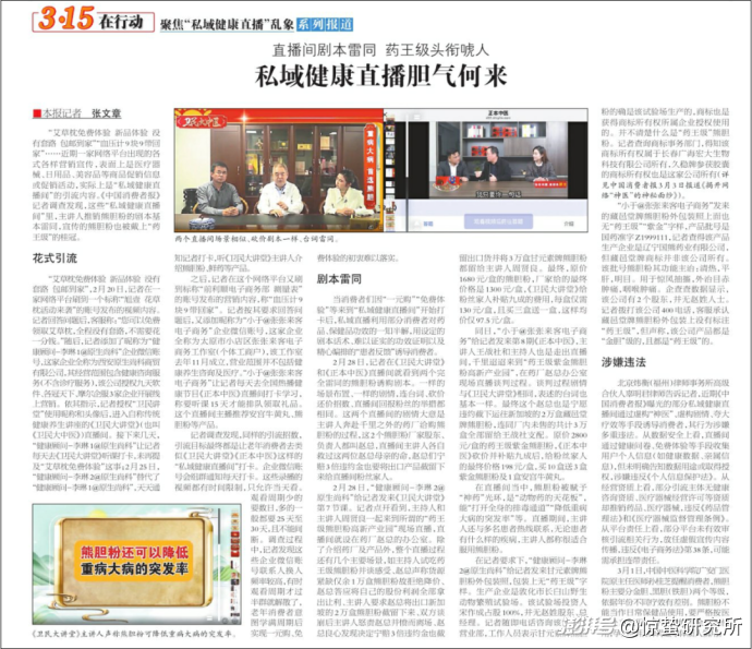 《中国消费者报》3月4日头版报道了私域健康直播间利用促销信息或促销活动吸引老年人观众,然后借助剧本兜售熊胆粉的典型案例。报道中提到,一些直播间通过发布艾草枕免费体验新品体验没有套路包邮到家血压计9块9带回家等促销内容,吸引老年人添加客服人员的企业微信账号,随后被客服拉进私域健康直播间,并且要求每天听课打卡达到一定天数才能排队领取礼品。