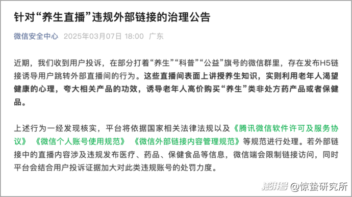 3月7日,微信安全中心发布公告称,近期收到用户投诉,部分打着养生科普公益旗号的微信群,存在通过发布H5链接诱导用户跳转外部直播间的行为。这些直播间借讲授养生知识,利用老年人渴望健康的心理,夸大相关产品功效,诱导老年人高价购买养生类非处方药或保健品。