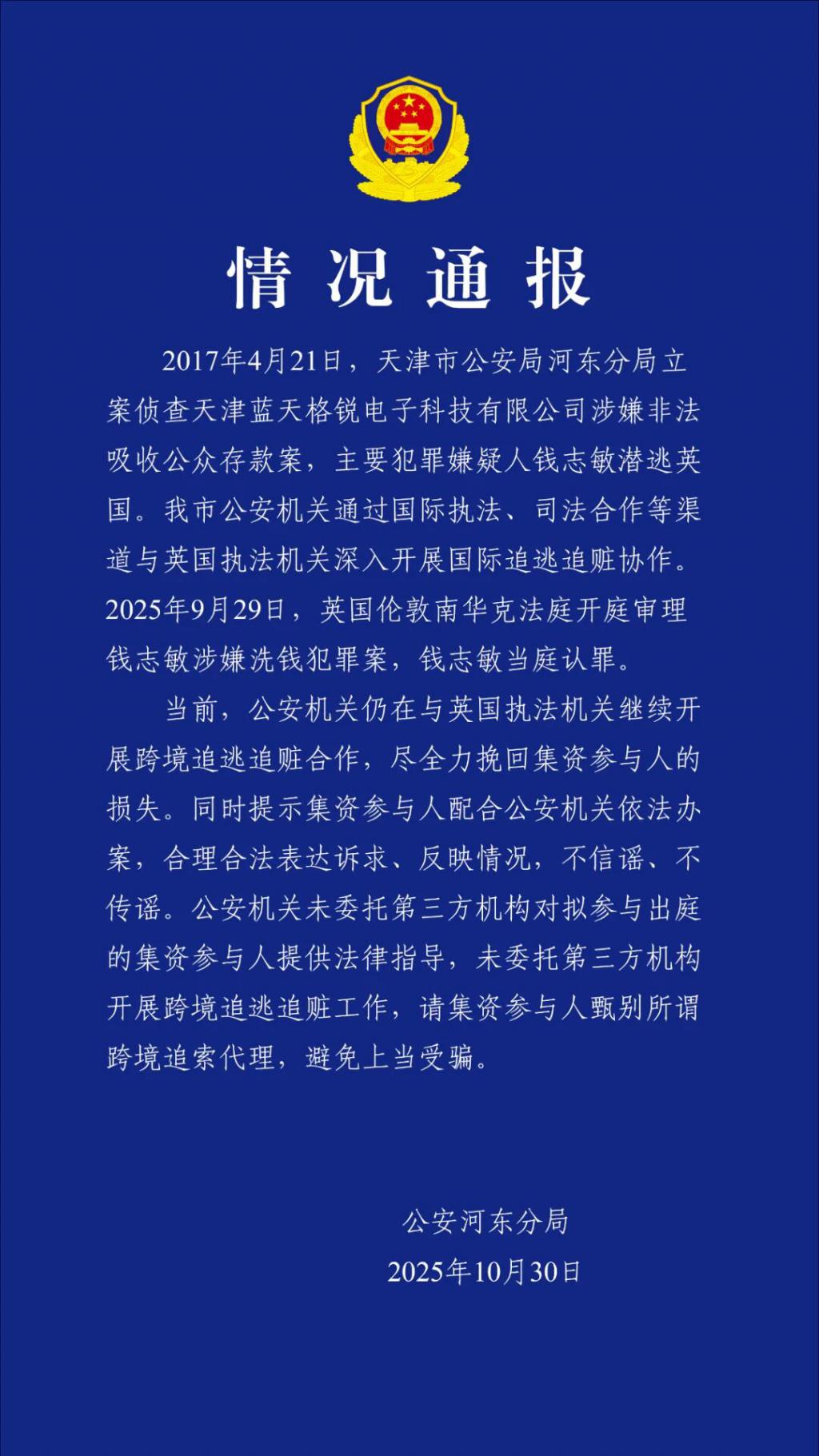 今年 10 月 30 日,天津市公安局河东分局发布情况通报:2017 年 4 月 21 日,天津市公安局河东分局立案侦查天津蓝天格锐公司涉嫌非法吸收公众存款案,主要犯罪嫌疑人钱志敏潜逃英国。天津市公安机关与英国执法机关深入开展国际追逃追赃协作。9 月 29 日,英国伦敦南华克法庭开庭审理钱志敏涉嫌洗钱犯罪案,钱志敏当庭认罪。