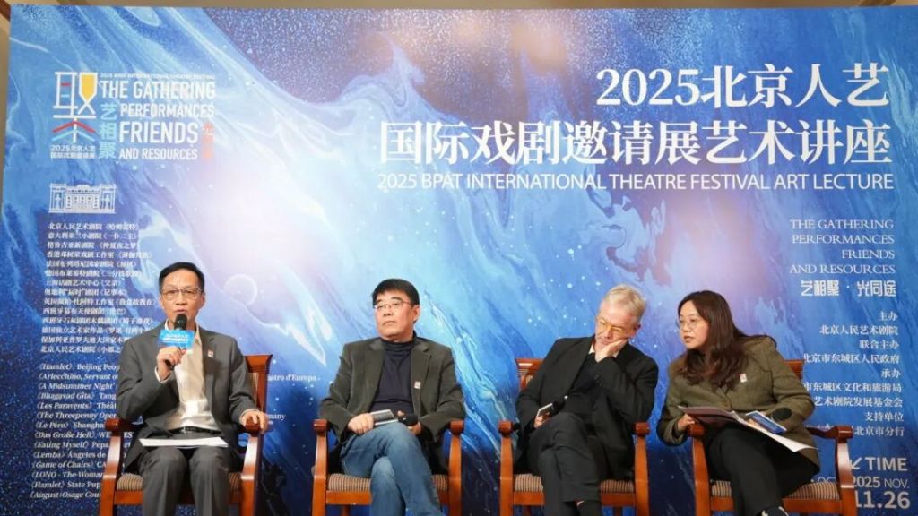 艺术讲座现场,(从左至右)北京人艺院长冯远征、德国戏剧研究专家陈平、布莱希特剧院艺术总监奥利弗·里斯、现场翻译张晏。