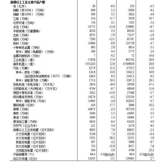 分产品看,10 月份,规模以上工业 623 种产品中有 313 种产品产量同比增长。其中,钢材 11864 万吨,同比下降 0.9%;水泥 14775 万吨,下降 15.8%;十种有色金属 695 万吨,增长 2.9%;乙烯 314 万吨,增长 11.7%;汽车 327.9 万辆,增长 11.2%,其中新能源汽车 171.0 万辆,增长 19.3%;发电量 8002 亿千瓦时,增长 7.9%;原油加工量 6343 万吨,增长 6.4%。