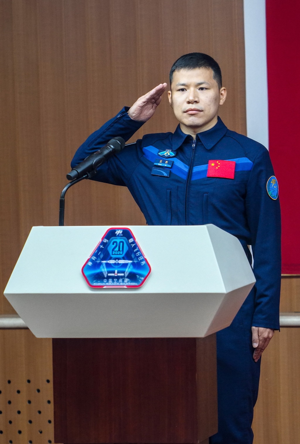 2025年4月24日,神舟二十号航天员陈冬、陈中瑞和王杰(左)在出征仪式上。王杰 摄