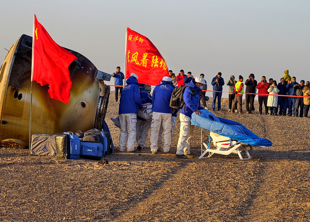 返回舱准确无误地降落在预报落点,医监医救车、专用吊臂车、现场警戒车等迅速向返回舱聚集。