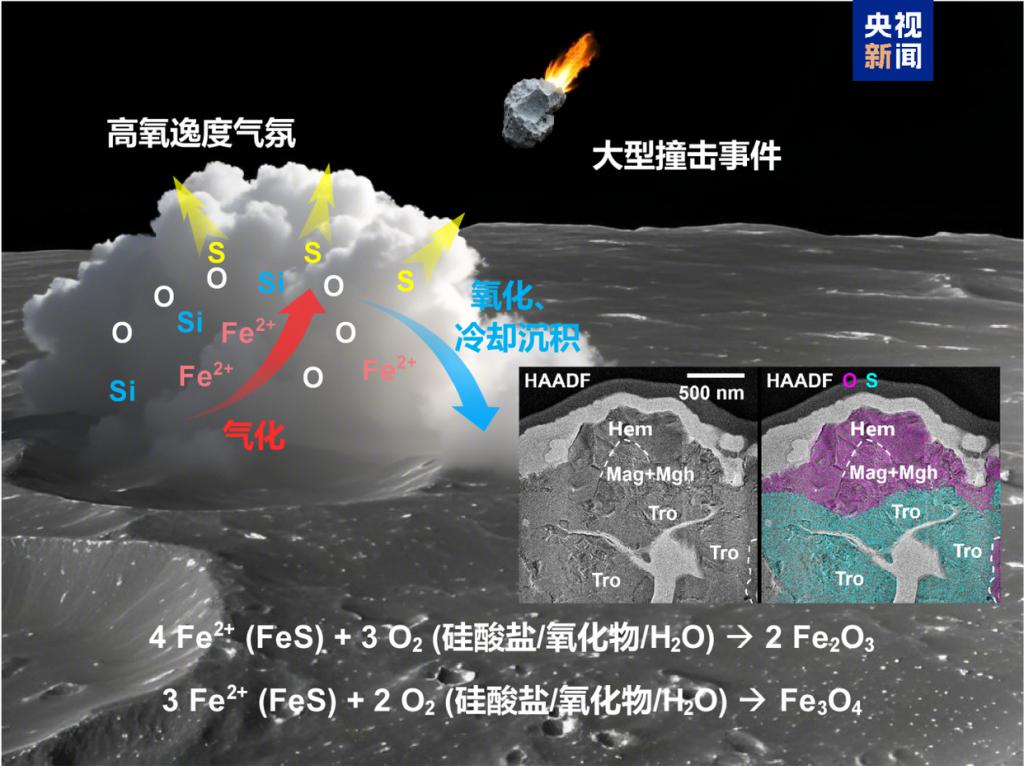 研究提出,赤铁矿的形成可能与月球历史上的大型撞击事件密切相关。大型撞击形成瞬时高氧逸度气相环境的同时,铁元素在高氧逸度环境中被氧化,使陨硫铁发生了脱硫反应,经气相沉积过程形成微米级晶质赤铁矿颗粒。值得关注的是,该反应的中间产物为具有磁性的磁铁矿和磁赤铁矿,可能是南极 - 艾特肯盆地边缘磁异常的矿物载体。该研究首次利用样品证实了在超还原背景下月球表面存在赤铁矿等强氧化性物质,揭示了月球的氧化还原状态以及磁异常成因。