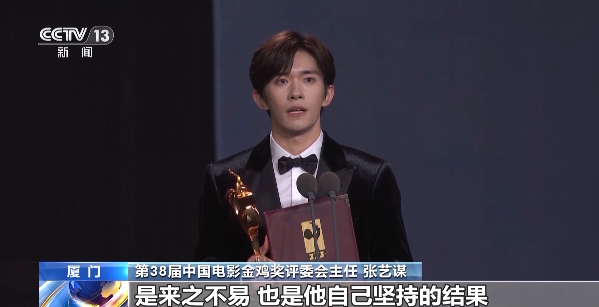 第38届中国电影金鸡奖评委会主任 张艺谋:易烊千玺(最佳男主角)我合作了第二次了,我觉得他是一个很难得的优秀的年轻演员。其实,很早我就关注他,我觉得他今天得到大家的认可来之不易,也是他自己坚持的结果、努力的结果。你会看到他在表演这个领域,他的一种敬畏感、他的一种孜孜不倦的努力。很难得,一个年轻的演员在今天没有偶像包袱。因为中国电影你要讲表演,那我们觉着把目光往下看,我们不一定要看我们的老戏骨,我们要看年轻的新一代的演员。