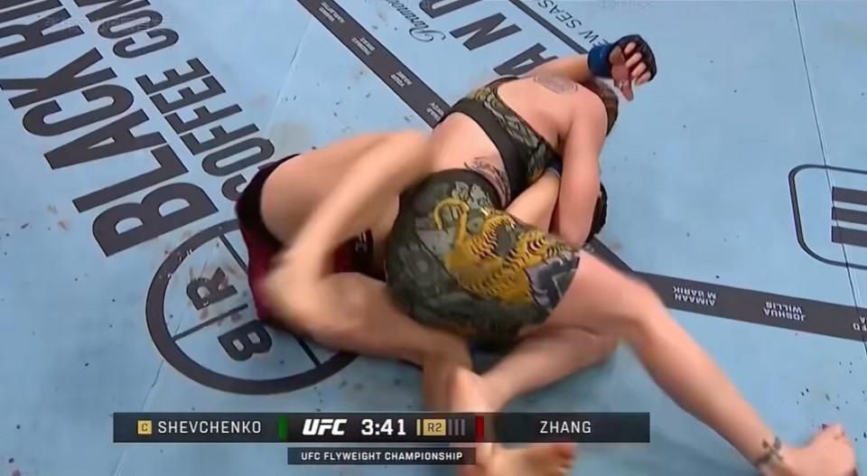第二回合张伟丽继续主动近身搂抱,舍甫琴科发力抱摔成功,来到地面之后舍甫琴科再次压制张伟丽。地面缠斗过程中张伟丽处于被动,舍甫琴科在上位寻找砸击机会。舍甫琴科持续上位压制,第二回合结束。