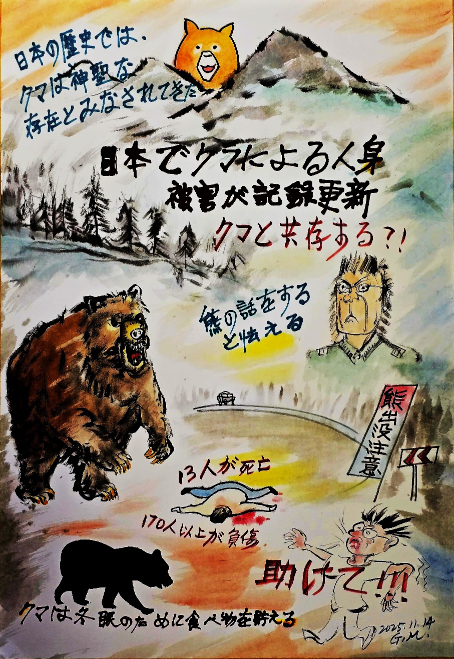 图2 日本“熊杀人”创纪录,“熊灾”问题为何棘手? 纸本彩墨 65cm X 45cm 李公明 作 2025年11月14日