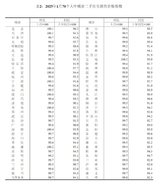 2025 年 1 月 70 个城市二手住宅销售价格指数 / 图源:中国商报