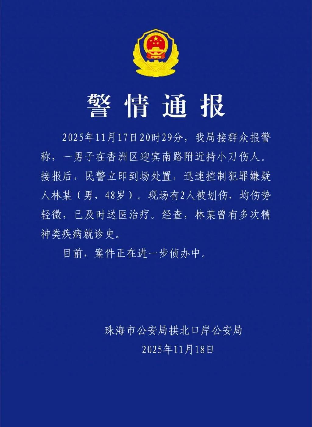 珠海市公安局拱北口岸公安局发布警情通报:2025 年 11 月 17 日 20 时 29 分,我局接群众报警称,一男子在香洲区迎宾南路附近持小刀伤人。接报后,民警立即到场处置,迅速控制犯罪嫌疑人林某(男,48 岁)。现场有 2 人被划伤,均伤势轻微,已及时送医治疗。经查,林某曾有多次精神类疾病就诊史。目前,案件正在进一步侦办中。