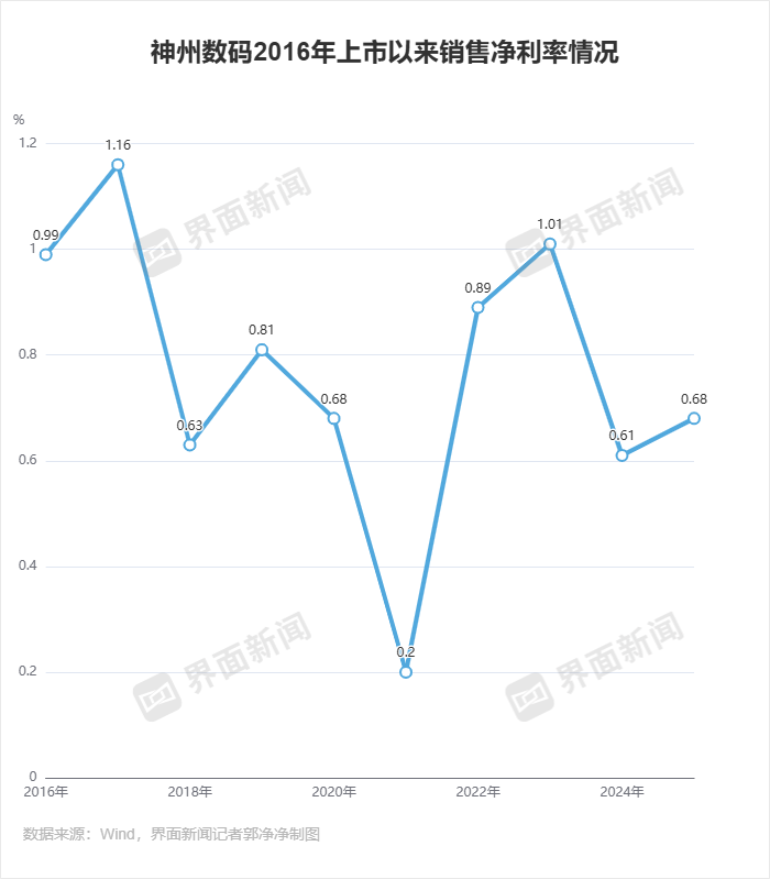 从销售净利率来看,神州数码的盈利能力衰退表现更为明显。2016年以来,该公司的销售净利率就徘徊在1%左右,于2021年曾跌至0.2%谷底,此后在2023年回升至1.01%;但近两年再次大幅下滑。持续低于1%的销售净利率,意味着公司抗风险能力极弱,一旦遭遇行业波动或资金链紧张,就可能陷入亏损境地。