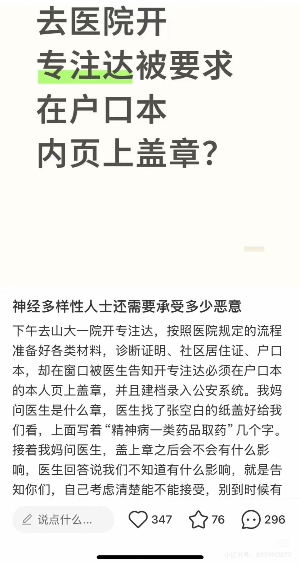 这个做法最让人诟病的,还是涉嫌歧视 ADHD 患者。不管得了何种病,患者都有正常看病开药的权利,隐私应该得到保护,而不能被医院盖章标记。尤其现在确诊 ADHD 并且接受治疗的大部分是未成年人,他们的隐私更应该得到保护。户口本被盖章,增加了整个家庭的病耻感不说,还有可能附带来自其他方面的歧视。