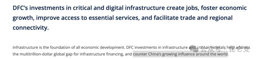 反观美国主导对非投资的机构——美国国际发展金融公司。这个成立于 2019 年的机构在其官网上毫不掩饰地宣称,其成立的战略目的就是锁定关键矿产、供应链、战略通道,是 " 遏制中国在世界各地日益增长的影响力 "。