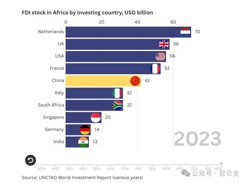 一是增长速度快。在 21 世纪初,中国在非洲几乎没有任何投资。即便在 2010 年,中国在非洲的 FDI 存量仅为 130 亿美元,还不及新加坡(200 亿美元)或马来西亚(170 亿美元)。然而,到了 2020 年代,这一数字激增至超过 400 亿美元,使中国跻身非洲前五大 FDI 来源国之列。