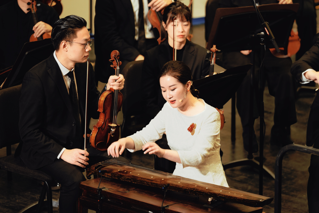 本场音乐会策划了古琴独奏、琴歌吟唱、琴箫重奏及古琴与交响乐协奏等多种演出形式。上半场,梁雨滋以管平湖打谱的《离骚》《流水》等传统曲目展现古琴的魅力;下半场则创新演绎交响诗《琴咏春秋》与《离骚》协奏曲,古琴与西洋乐队的对话既保留文人风骨,又注入宏大叙事张力。琴歌《胡笳十八拍》《钗头凤》,更以声腔与琴韵的融合,传递出诗词中的千古情愫。