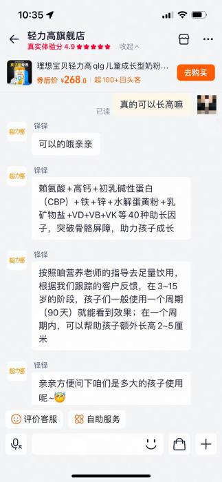 轻力高旗舰店客服宣称一个周期内可以帮助孩子额外长高 2-5 厘米