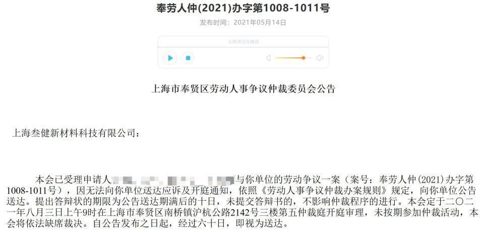 巧合的是,2021 年 5 月,上海市奉贤区人力资源和社会保障局披露了一则受理通知,4 名自然人因与上海叁健存在劳动争议,将上海叁健告到仲裁庭。同期披露的详细信息显示,其中至少 3 人在 2020 年 6 月后受聘进入上海叁健工作,但并未签订劳动合同。