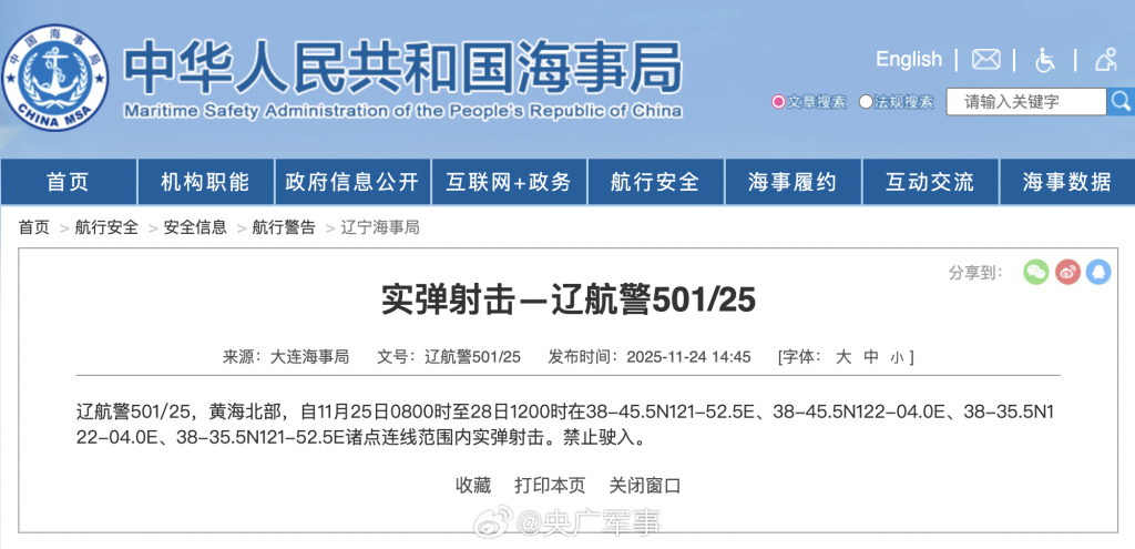 首页 > 资讯 航行警告!渤海部分海域执行军事任务,黄海北部连续4天实弹射击 大连海事局发布航行警告,自11月25日9时至16时,渤海部分海域执行军事任务;自11月25日8时至28日12时,黄海北部部分海域实弹射击,禁止驶入。