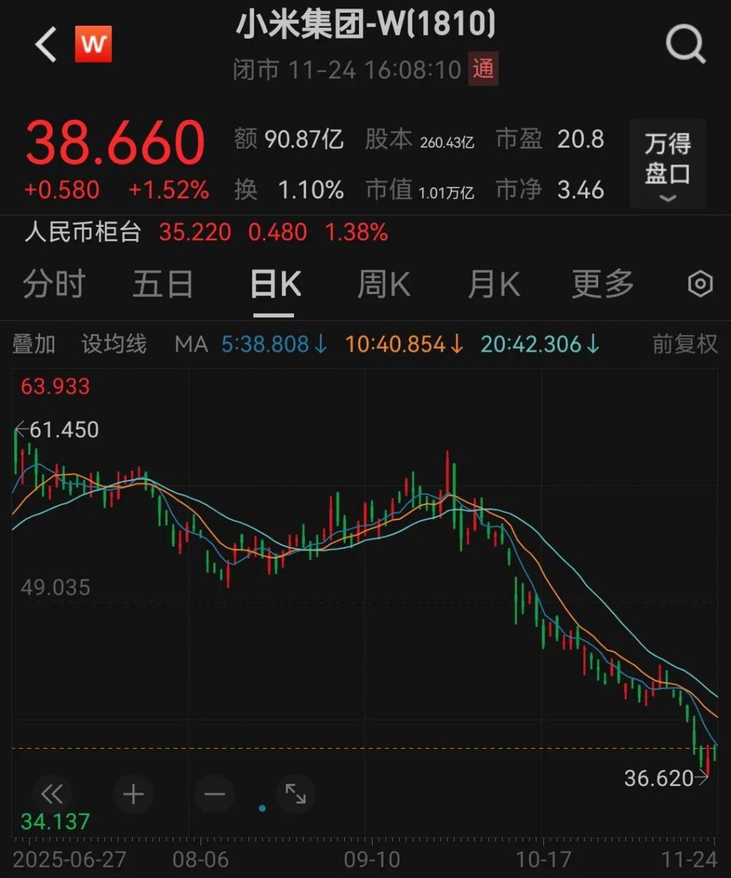 11 月 24 日晚间,小米集团 -W ( 01810 ) 发布公告,公司董事会获本公司创始人、执行董事、董事长、首席执行官兼控股股东雷军先生 ( 雷先生 ) 通知,雷先生于 2025 年 11 月 24 日自公开市场通过由其全资拥有的 Team Guide Limited 购入合共 260 万股本公司 B 类普通股,平均价为每股约 38.58 港元 ( 增持事项 ) 。以此计算,此次雷军增持总计耗费资金超过 1 亿港元。