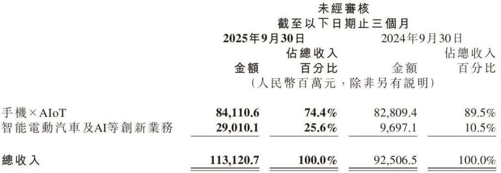 具体来看,第三季度,智能电动汽车及 AI 等创新业务分部收入 290 亿元,同比增长超 199%。其中,智能电动汽车收入 283 亿元,其他相关收入 7 亿元。小米汽车及 AI(人工智能)等创新业务分部首次实现单季度经营收益转正,实现单季经营收益 7 亿元。