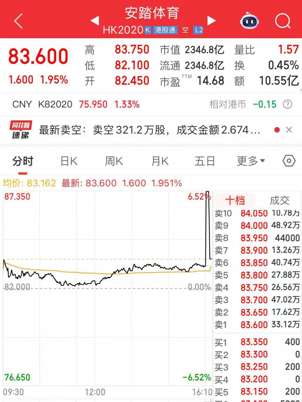 截至 11 月 24 日收盘,安踏体育上涨 1.95%,报 83.60 港元 / 股,市值为 2346.8 亿港元。