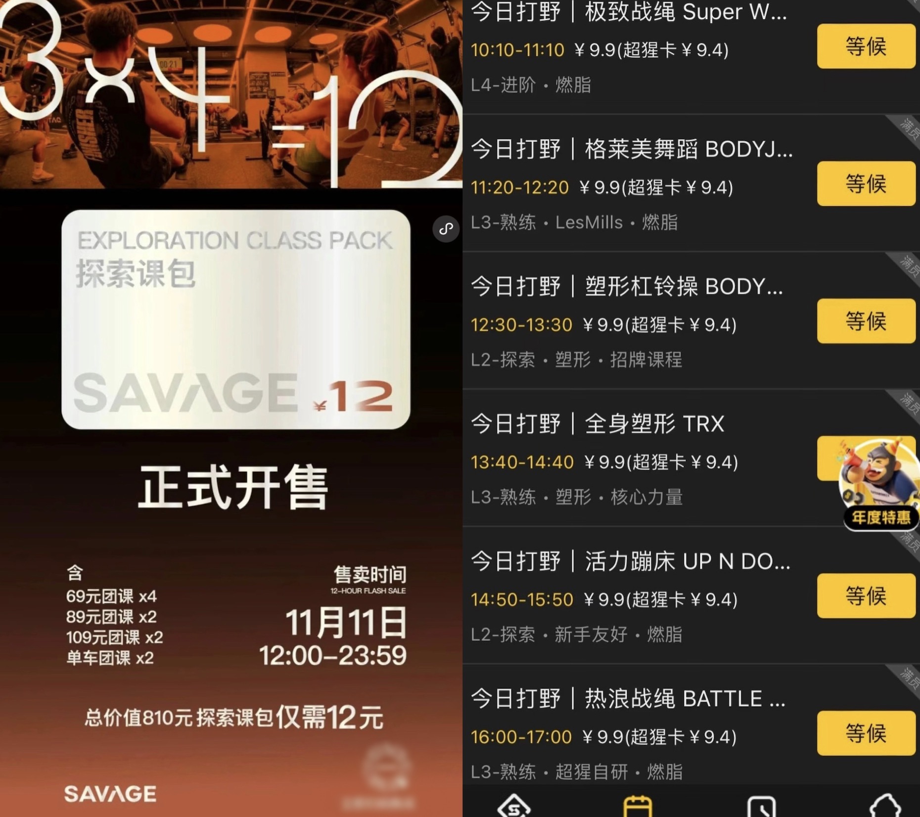 外部市场的竞争态势也在变得更加复杂。今年双十一期间,新兴品牌Savage(三明治)在北京、上海、深圳三城的4家新店发起了一场大胆的价格突袭,以“全城12元10节课”的极致低价策略,在社交媒体上迅速获得声量。这种低价营销方式在短期内确实有效提升了门店的客流与知名度,对超级猩猩等对手产生一定的压力。
