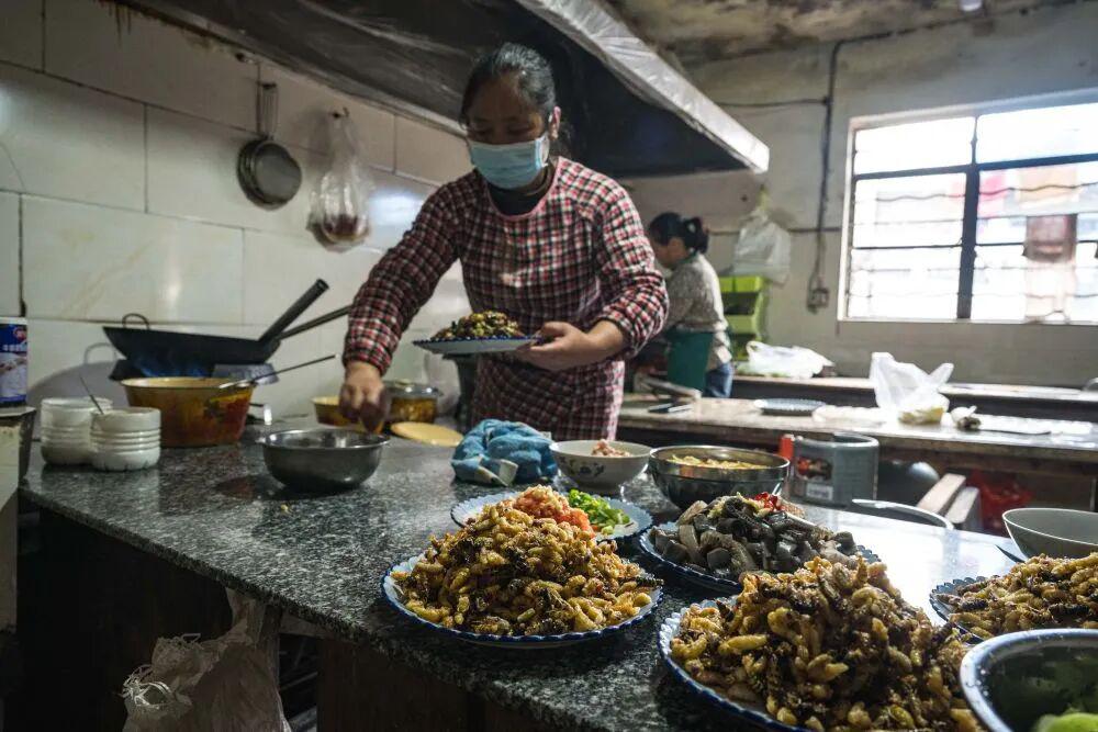11 月 19 日,云南省保山市龙陵县龙山镇一家餐馆工作人员在制作菜品炸胡蜂蛹。