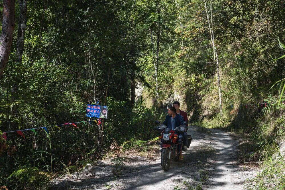 11 月 19 日,在云南省保山市龙陵县龙山镇,龙陵县黄氏蜂业有限公司工作人员骑车经过一处警示标志。