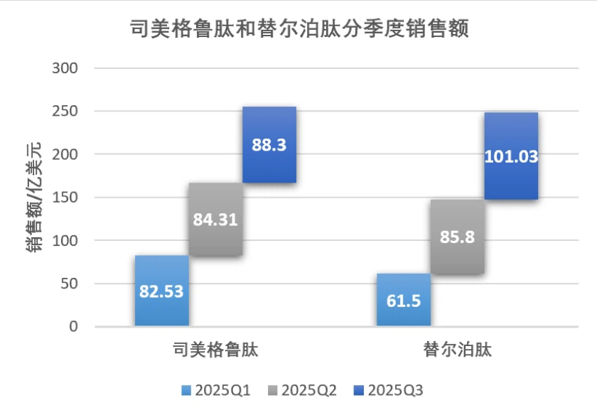 实际上,进入2025年,率先敲开减重市场大门的GLP-1R单靶点激动剂司美格鲁肽战胜默沙东的帕博利珠单抗(PD-1抑制剂,俗称“K药”),成为新的全球“药王”。同时,老对手礼来的GLP-1R/GIPR双靶点激动剂替尔泊肽也在抢夺司美格鲁肽市场份额。到第二季度,替尔泊肽销售额已超越司美格鲁肽。第三季度,两者差距进一步拉大。从全年观测,司美格鲁肽或被替尔泊肽超越,成为“最短命”药王。