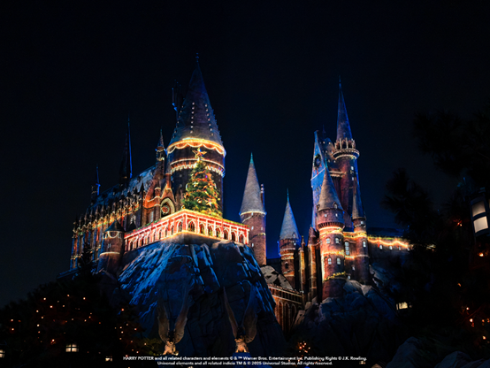 活动期间,哈利·波特的魔法世界™将以圣诞季为主题进行布置,重现电影中的节日场景。霍格莫德™街区将装饰有节日花环、浆果与缎带,并在夜间点亮橱窗灯光,营造冬日氛围。该区域还将首个霍格莫德™魔法圣诞树,游客可通过互动方式点亮树身。同时,霍格沃茨™城堡将在夜晚呈现以圣诞为主题的光影秀,还原电影中冬日场景与角色形象,青蛙合唱团™也将推出冬季限定表演。