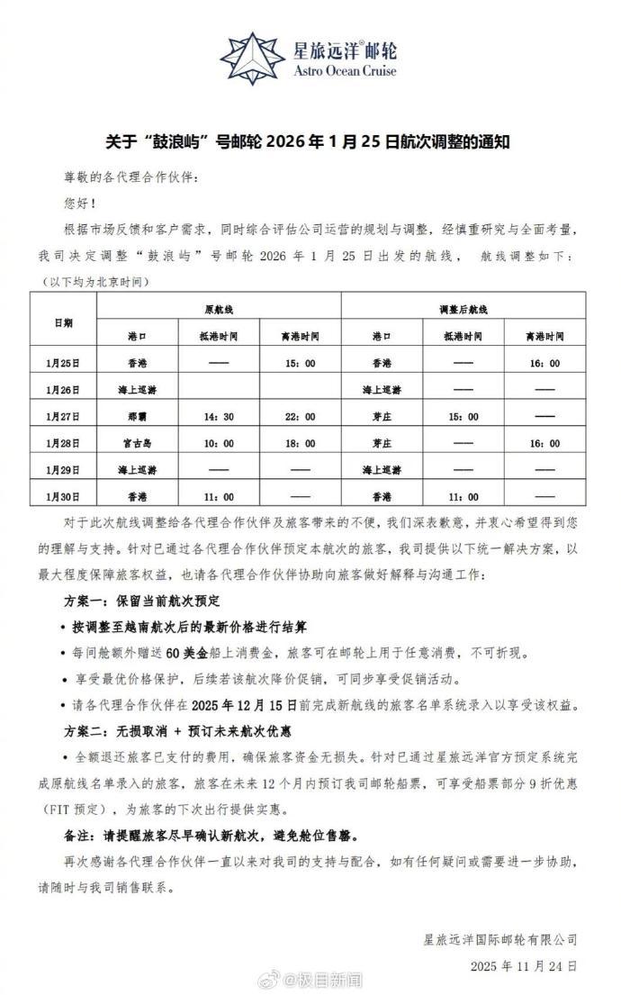 11月24日,星旅远洋邮轮发布航次调整通知,“鼓浪屿”号邮轮2026年1月25日出发的航线变更,目的地由日本宫古岛、那霸变为越南芽庄。