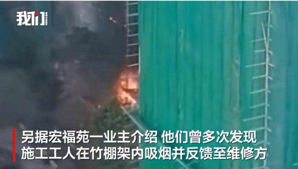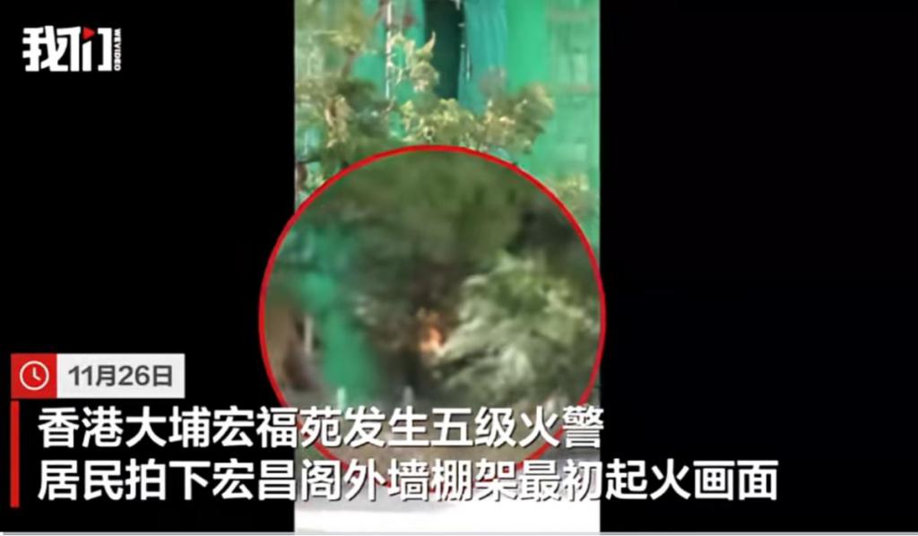 11 月 26 日,香港大埔宏福苑发生五级火警,居民拍下宏昌阁外墙棚架最初起火画面。 火势沿外墙保护网及棚架燃烧,蔓延至整幢大厦,整个过程不到 10 分钟。大量起火竹枝从高处坠落,现场有人不停大叫 " 走呀走呀 "。