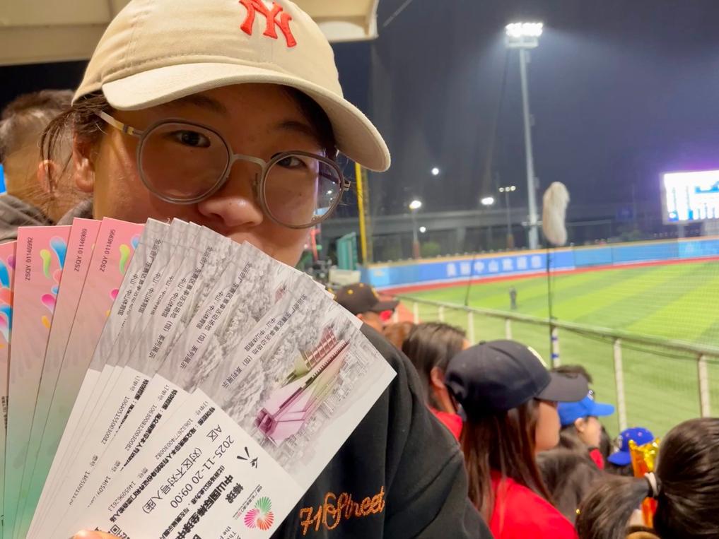 11 月 20 日,一名观众在全运会棒球比赛现场展示自己的票根。新华社记者霍思颖 摄