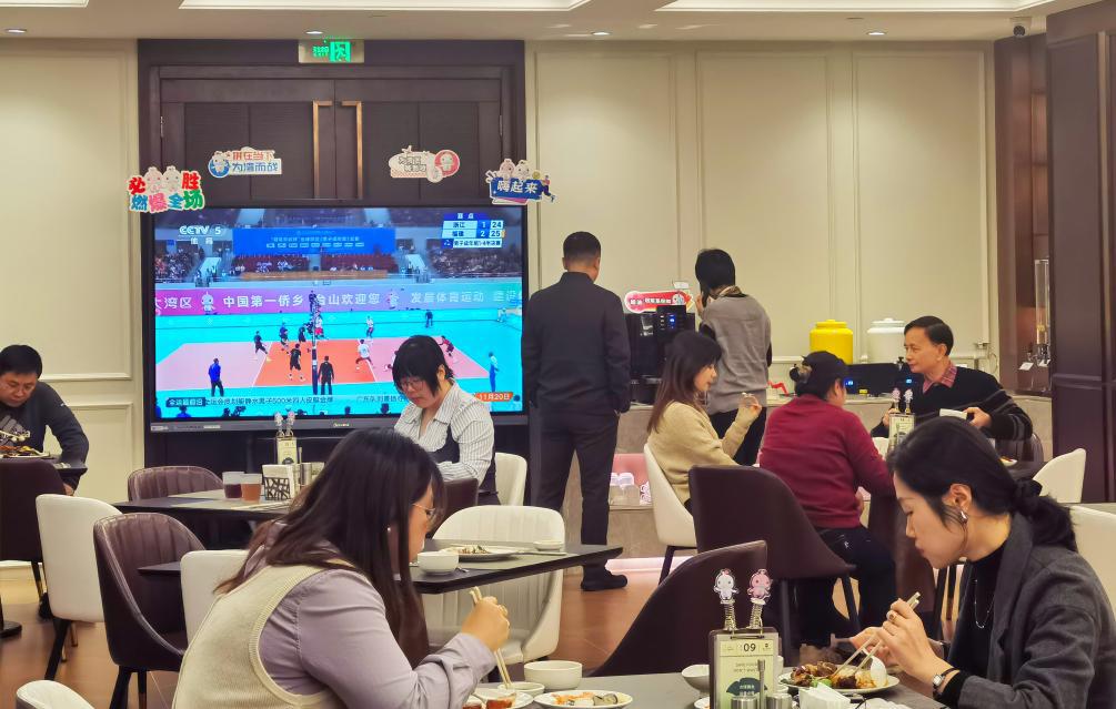 11 月 20 日,游客在广州一家餐厅内用餐,一旁的电视正转播全运会比赛。新华社记者洪泽华 摄