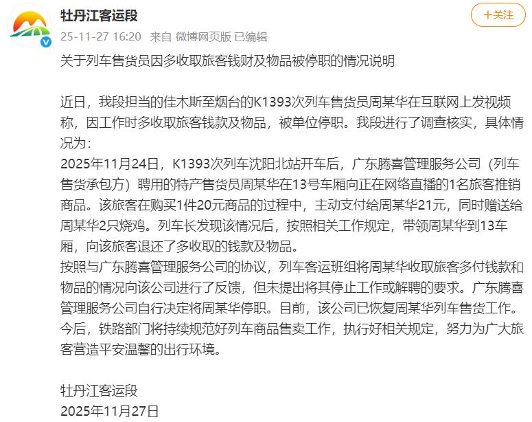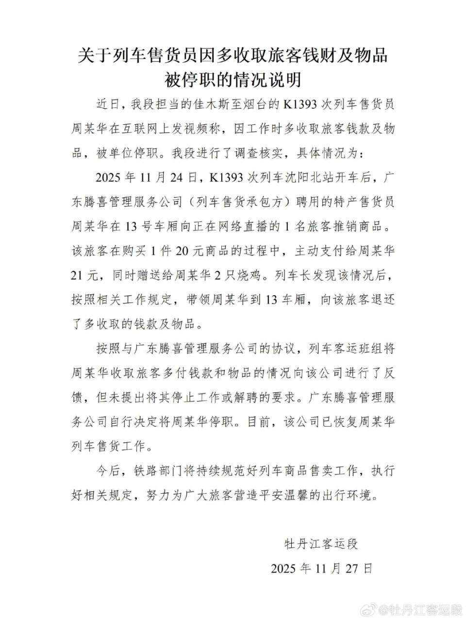 11 月 27 日,@牡丹江客运段 发布《关于列车售货员因多收取旅客钱财及物品被停职的情况说明》。